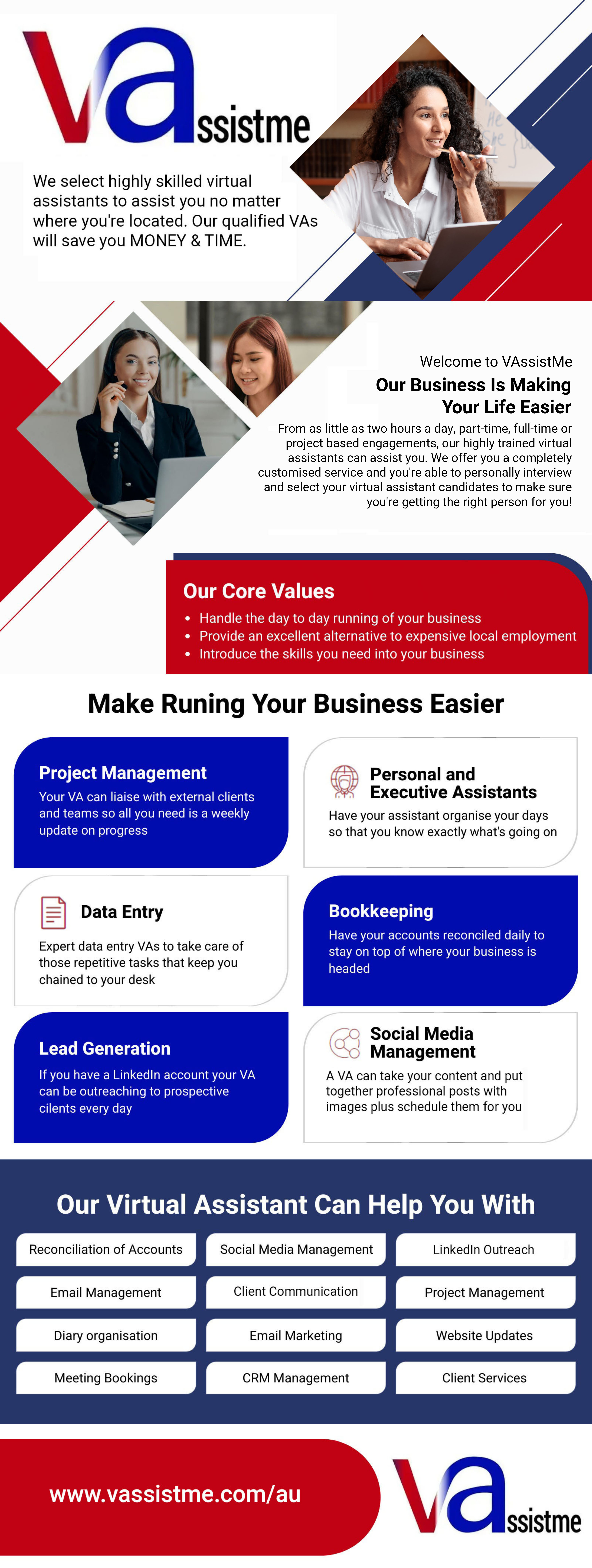 From as little as two hours a day to full-time, our highly trained Virtual Assistants can assist you, no matter where you’re located in Australia and beyond, with full time, part-time, fixed-term or project based engagements. We offer you a completely customised service, and you’re able to personally select and interview your Virtual Assistant to make sure you’re getting the right person for you!