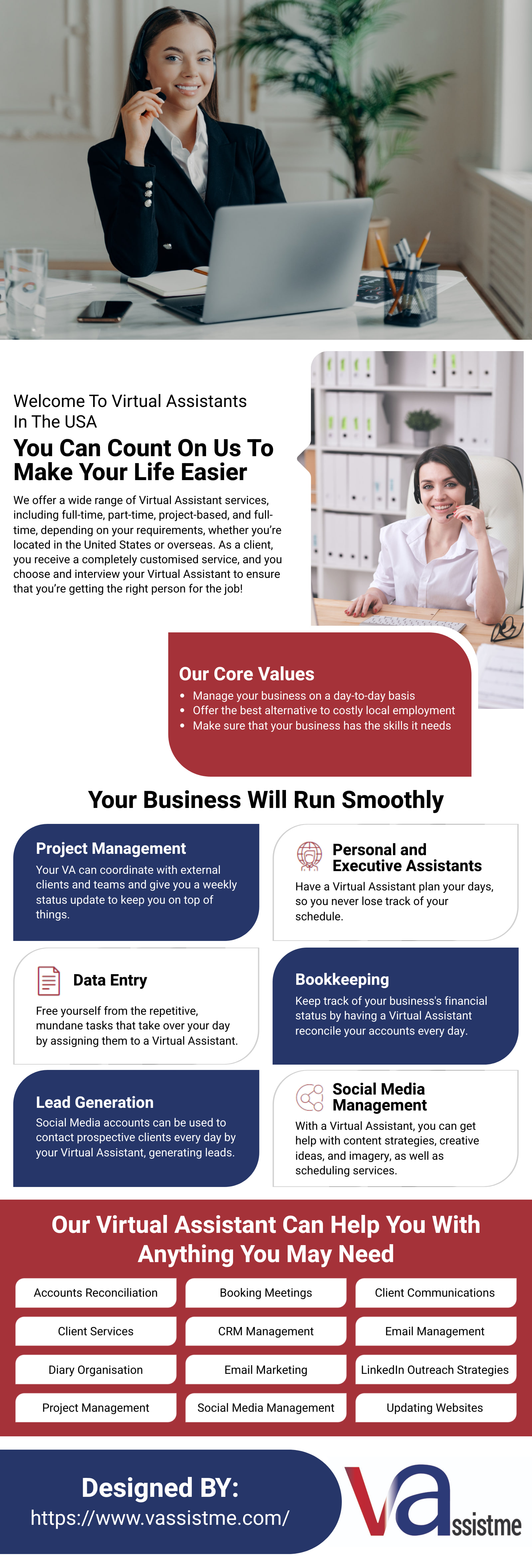 Virtual Assistant USA is in charge of offering business management professionals remote support. Conducting research and organizing data, engaging with clients or customers on behalf of their firm, and executing other secretarial activities such as updating calendars or sorting documents are all part of our responsibilities. VAssistme expert virtual assistants are adept at using technology and software tools. This enables them to carry out their job obligations from remote areas properly. They also have outstanding written and verbal communication skills, allowing them to compose professional documents and professionally converse with business customers.